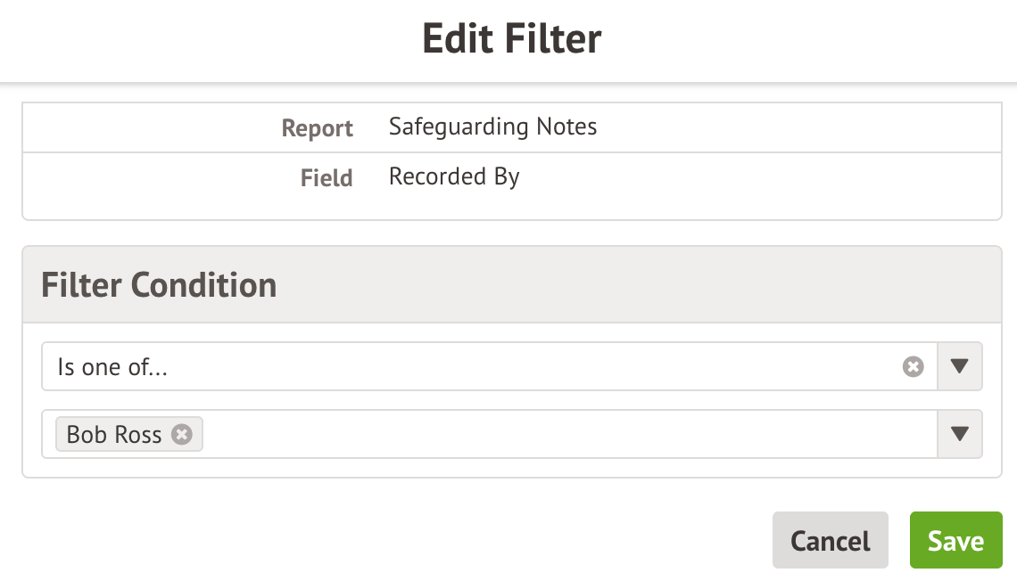 Then you can set your filter parameters. For example, if you select Filter Condition: Is one of... and then select one/multiple staff members, your generated report will only show safeguarding notes recorded by these staff members. Click Save to set this filter.