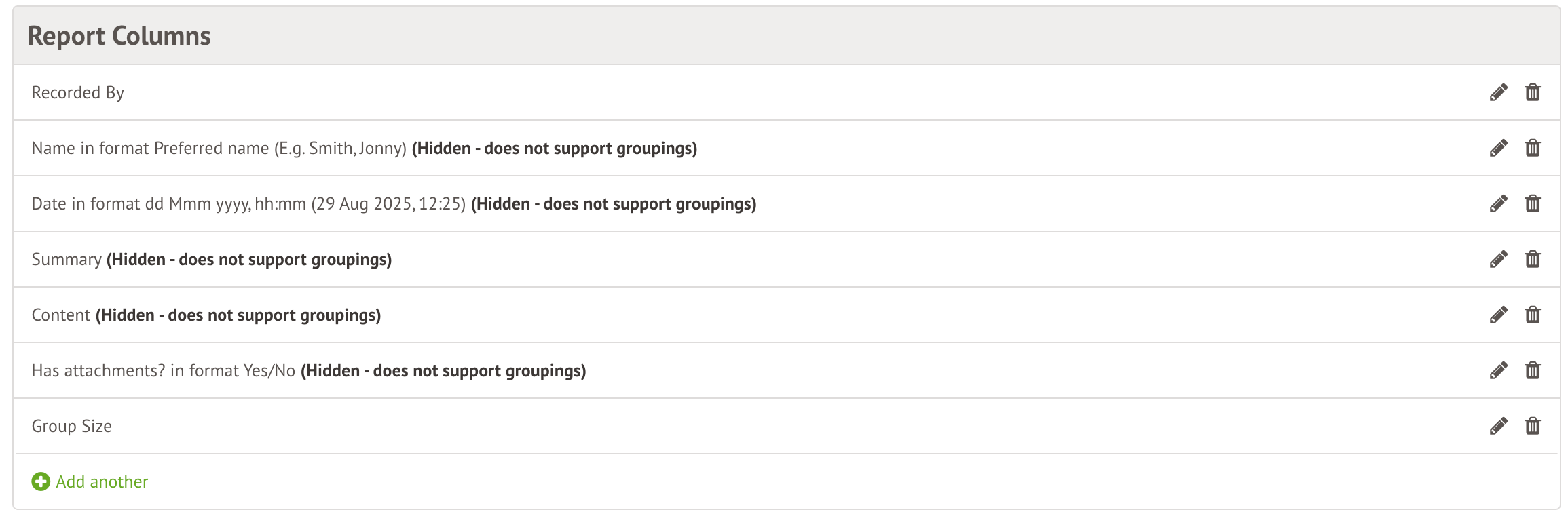 For example, if you add a grouping of Recorded By to the report, you will see the numbers of safeguarding notes recorded by different staff members, but you would no longer be able to see the Content details for the notes.