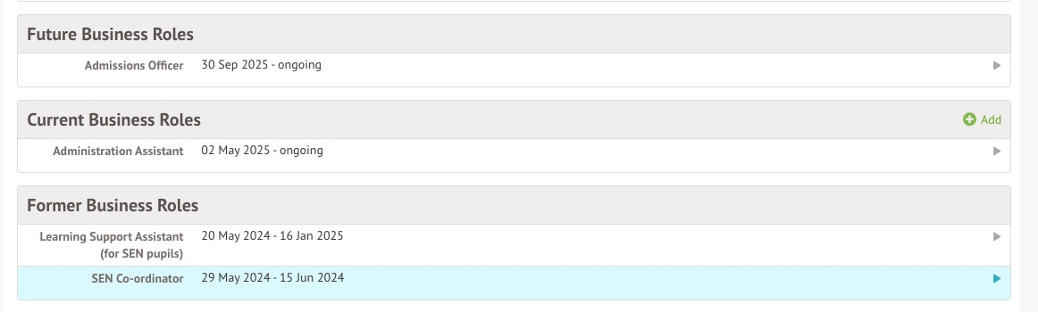 Use the Future, Current and Former Business Roles sections to see an overview of the roles assigned to a staff member. The Former and Future Roles sections only display roles with end dates in the past (Former) or with future start dates (Future). The Current Roles area shows that no role is assigned.