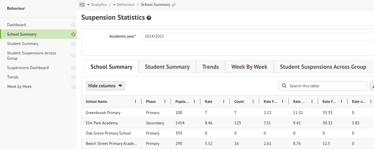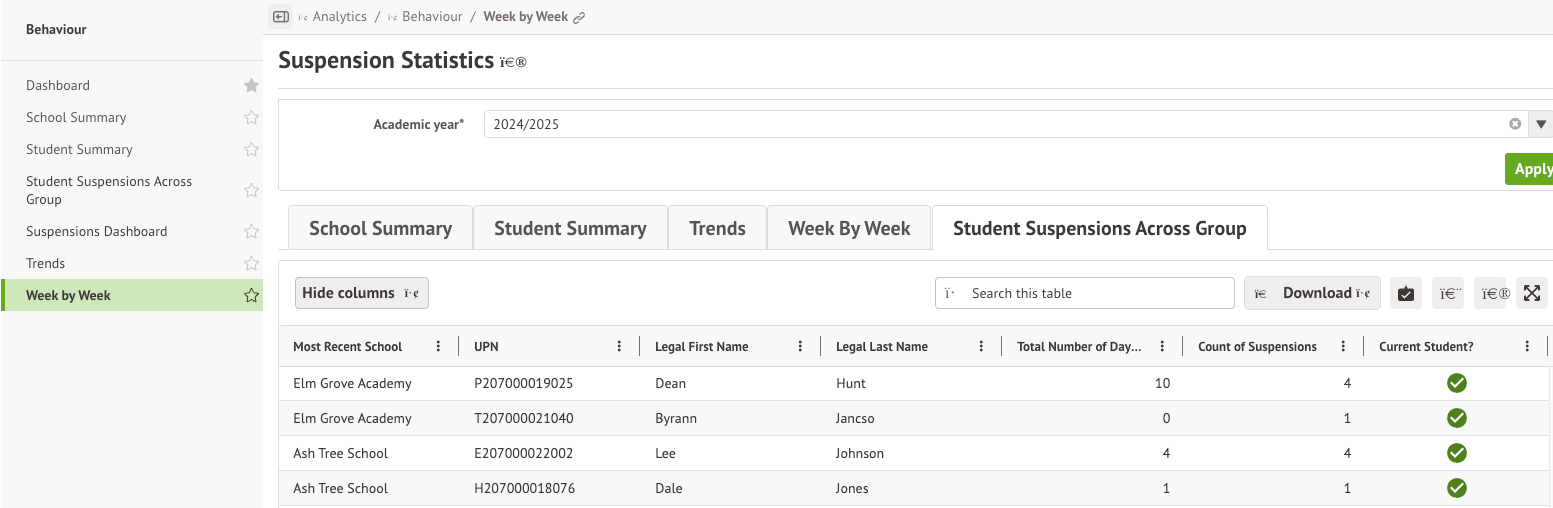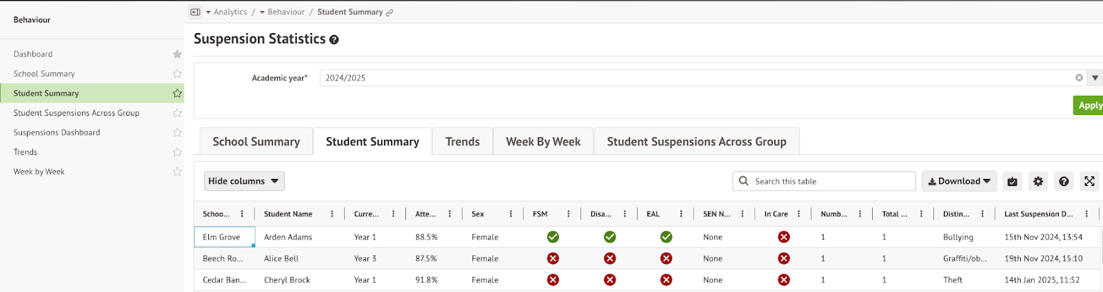• The cohort included is different depending on the dataset. In some cases like School Summary we’ve designed this to align as closely as possible to DfE standards. For others, such as Student Summary it was designed to help you support all students with suspensions regardless of their enrolment mode.