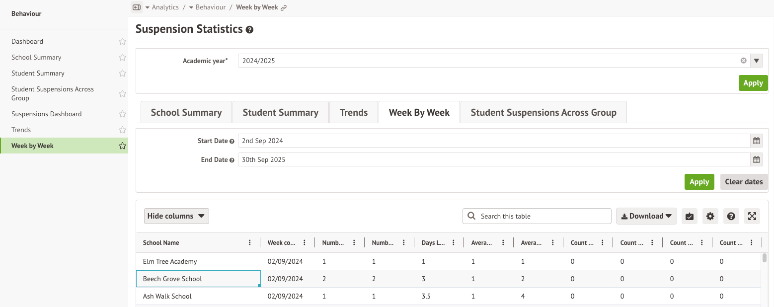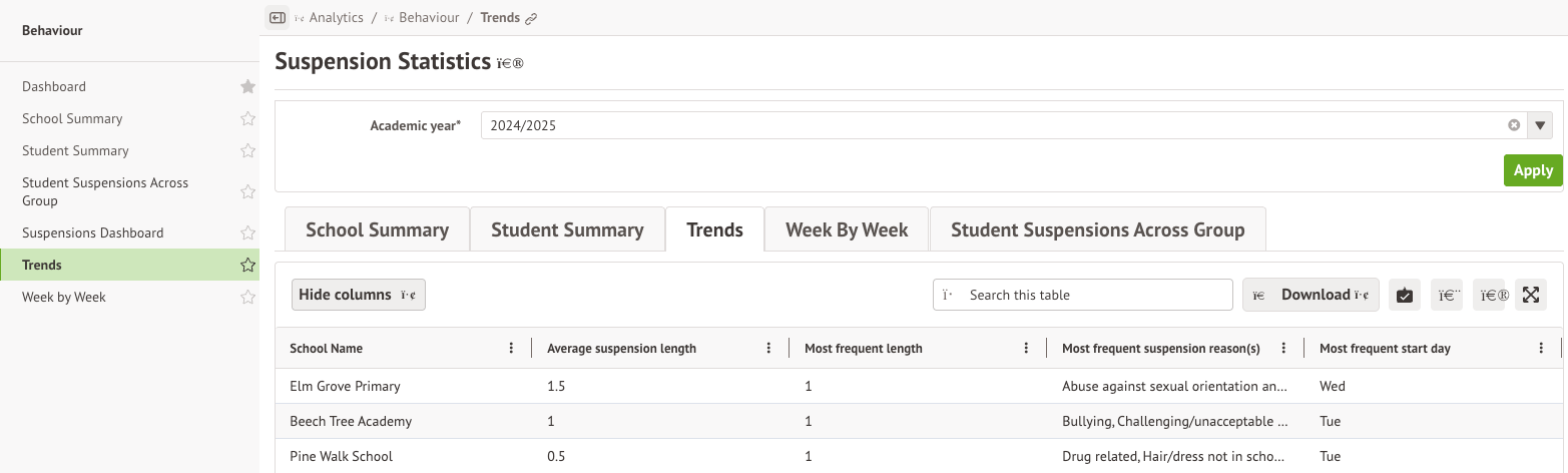 Allows you to compare week by week trends across your schools in terms of numbers and year groups. This allows you to identify particular at-risk cohorts or points in the school year when suspension rates rise.