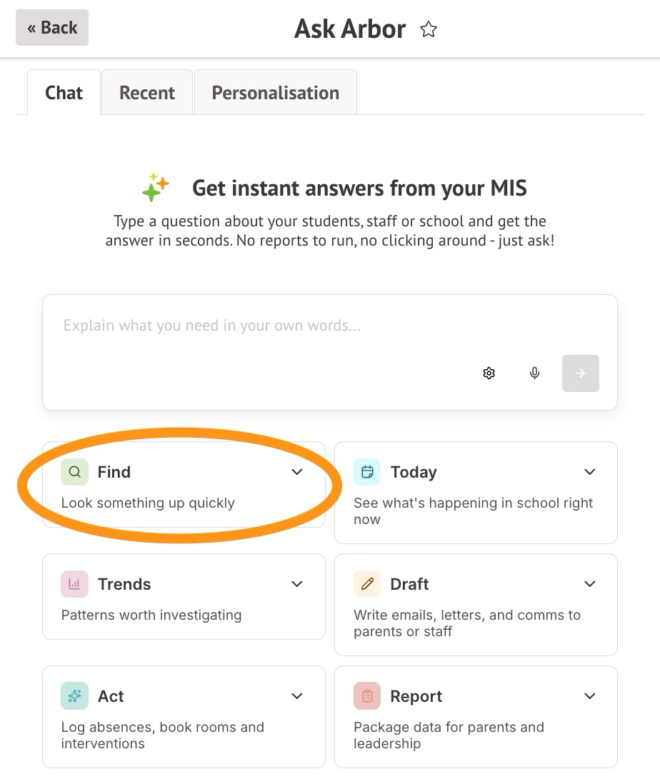 This guide outlines prompts you can use to look something up quickly with Ask Arbor. These are the types of prompts you can find when you click the Find tile to start a new chat. Find prompts aim to help you locate specific student, staff, or school data instantly, without clicking through menus or profiles.