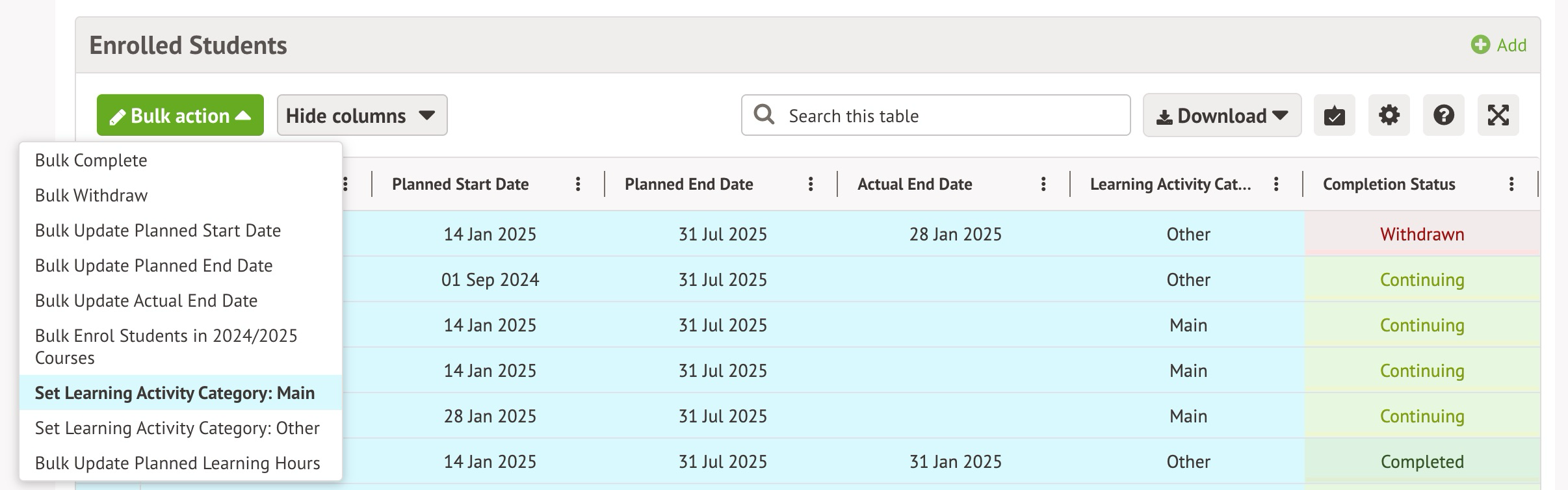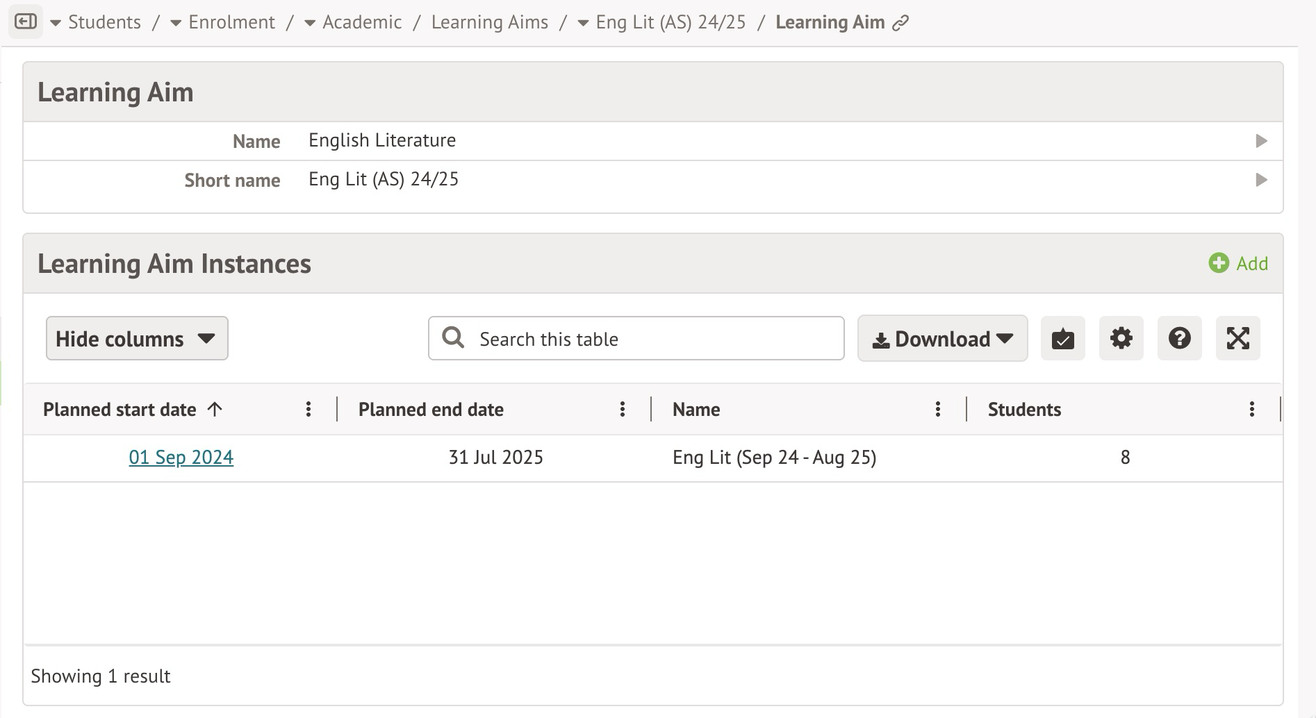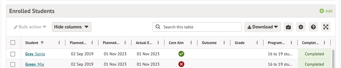 In the Learning Aim instance, you'll see a table for enrolled students. Enrol students with these steps: