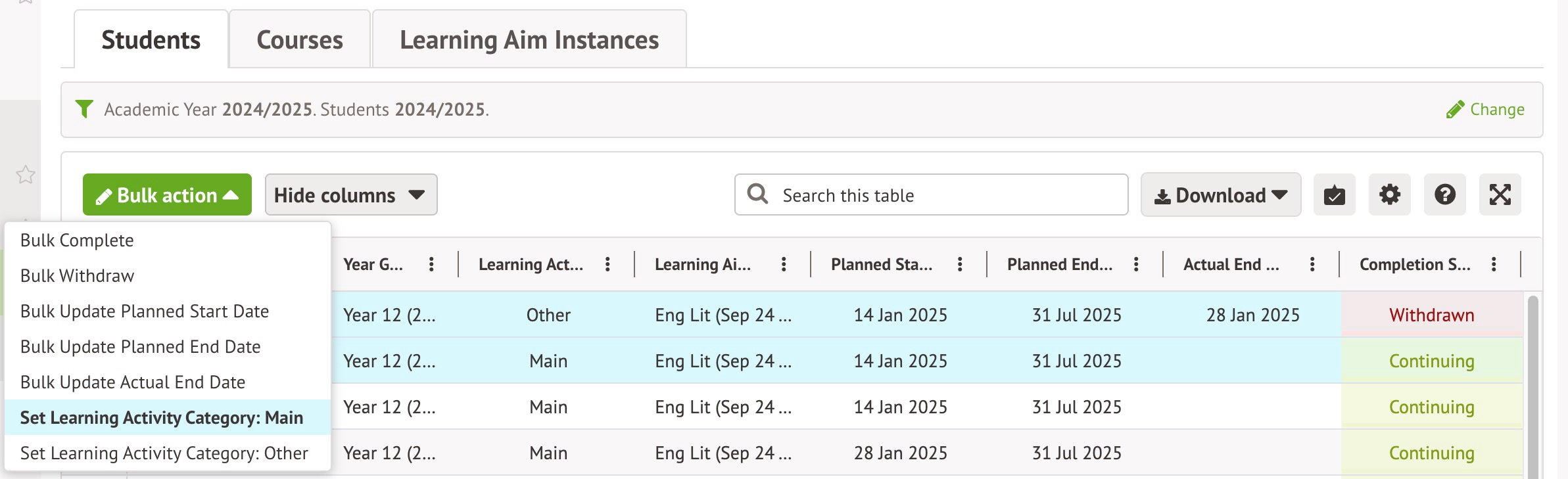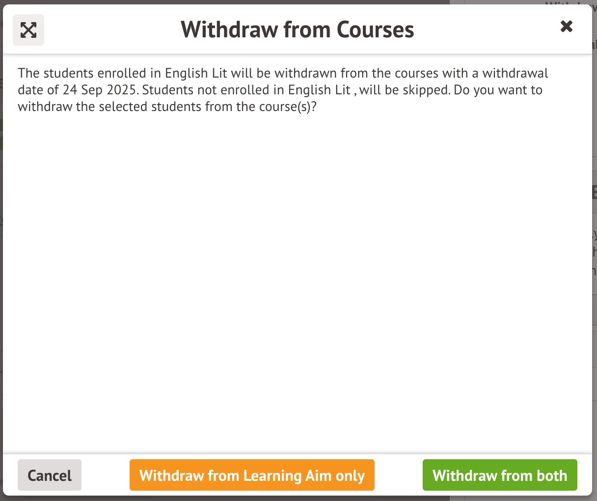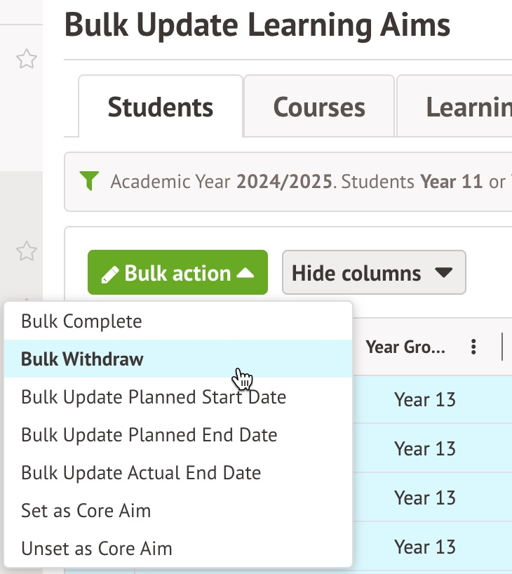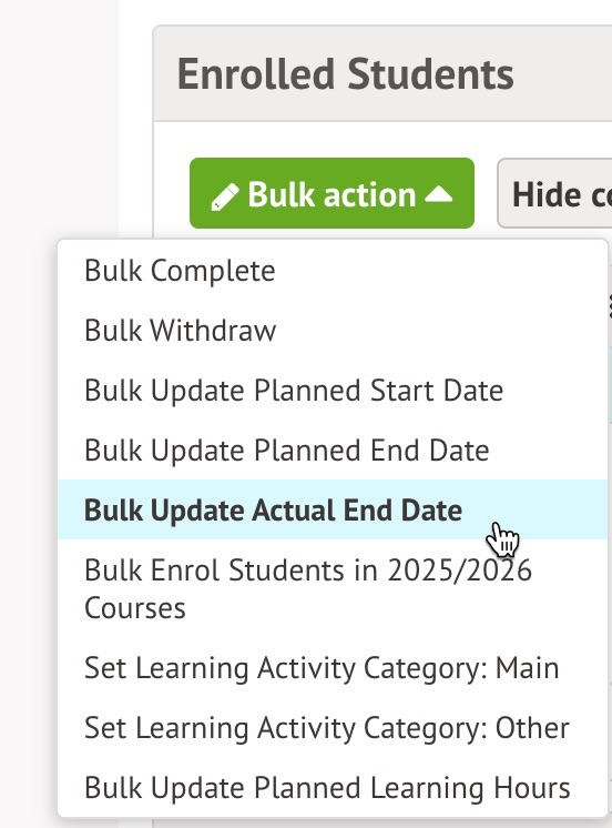 You can do this from the Learning Aims section on the Enrolments page of a student's profile , from the Enrolled students section within the Learning Aim Instance's Overview, or the Students tab on Students > All Students > Bulk Update > Bulk Update Learning Aims page.