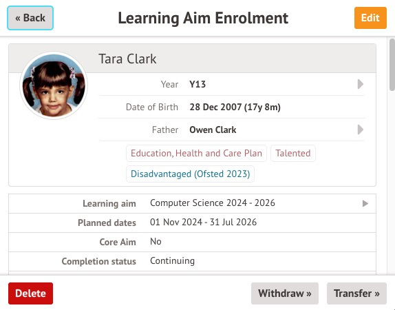 You can click into an individual student to amend their Learning Aim enrolment start and end dates by clicking Edit on the slide-over.