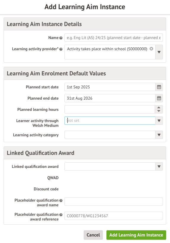 - Name (optional) - Adding an optional name will allow you to identify the Learning Aim Instance quickly. You may want to use the learning aim name and an indication of how long the learning aim will run for. If left blank, it will default to the learning aim name (or short name if specified) followed by the planned start and end dates, e.g. Eng Lit (AS) 24/25 (planned start date - planned end date).