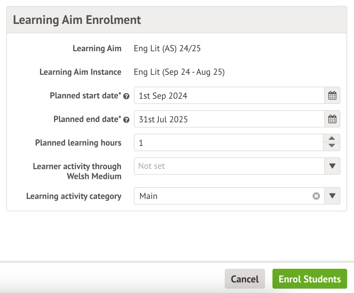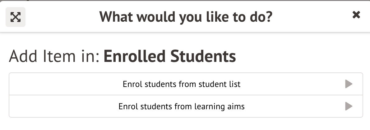 On the pop-up, select Enrol students from student list or Enrol students from Learning Aims. The first option allows you to enrol specific students in a dropdown list, the second allows you to add all of the students enrolled in a specific Learning Aim Instance in one go.
