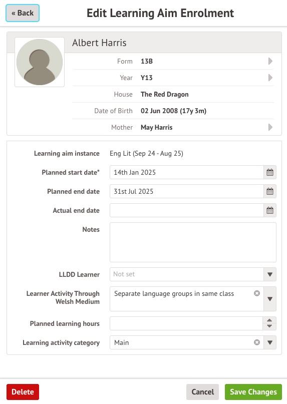 - Learner activity through Welsh Medium - lets you specify if the learning activity was delivered in Welsh. Options available are: English only, Welsh only, Formal bilingual model, Separate language groups in the same class