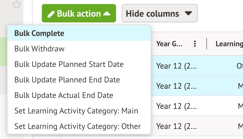 - Use the green Bulk action button and select Bulk Complete