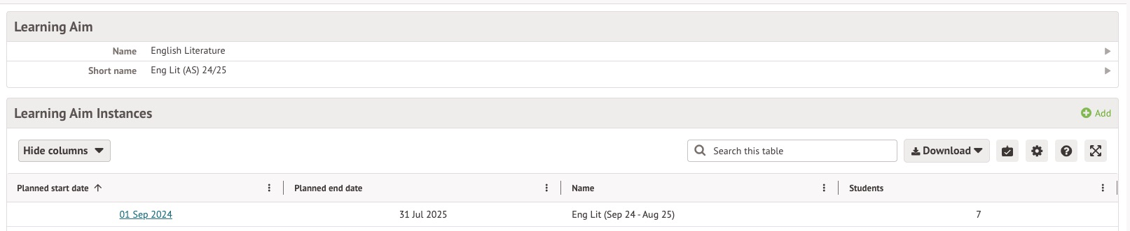 On the Learning Aim's Overview page, you're able to manage Learning Aim instances. An instance is a time period within which a Learning Aim is delivered. To add an Instance: