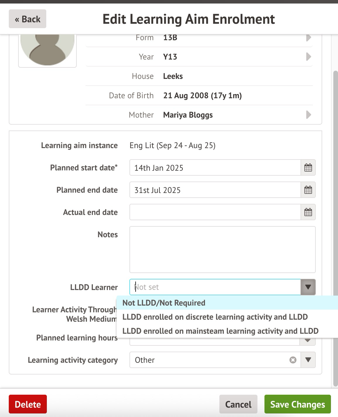 - For Learning Activity Category, the value populates with the Learning Aim Enrolment Default Values you set when creating the instance. If you leave this field blank, no value is automatically set.