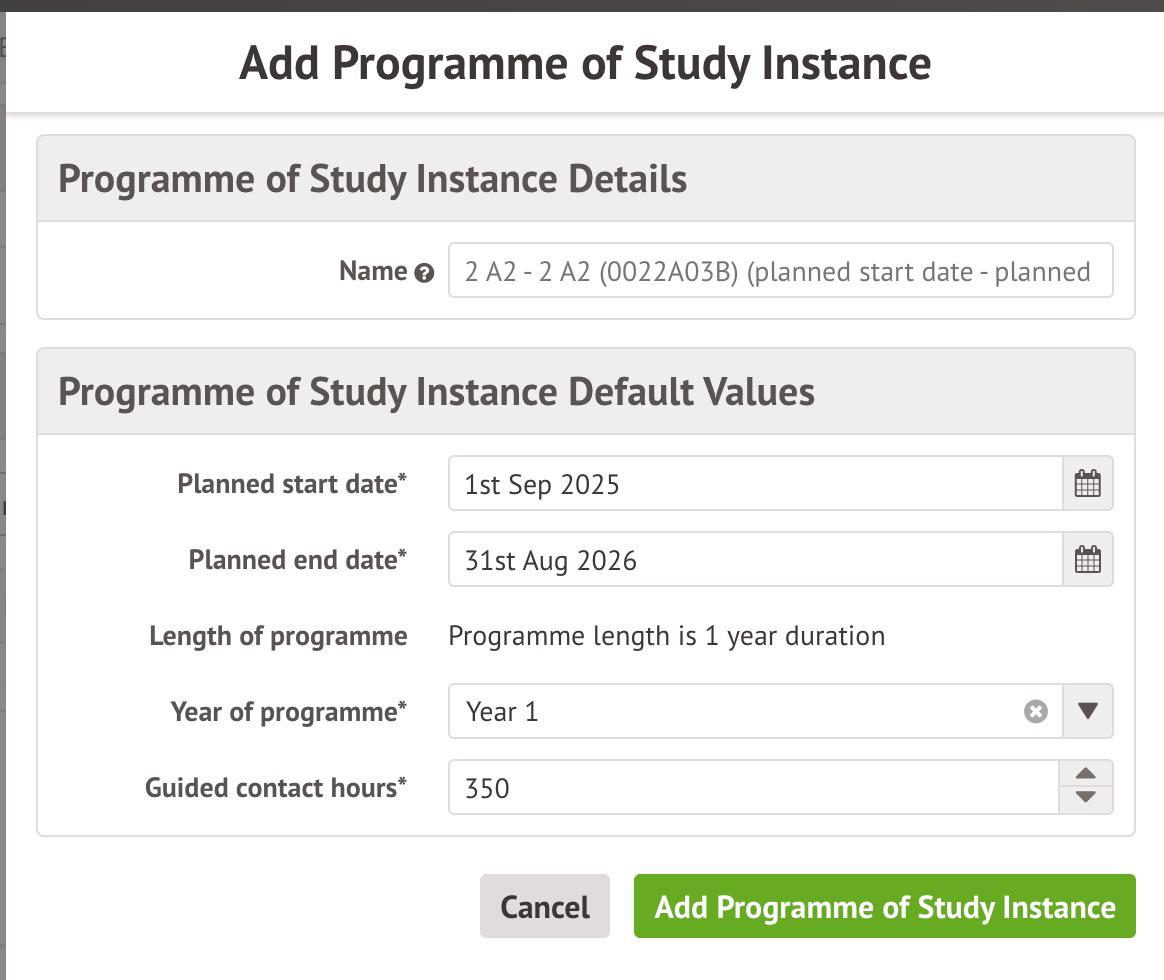 - Planned dates - add in the planned start and end dates of the Programme of Study Instance