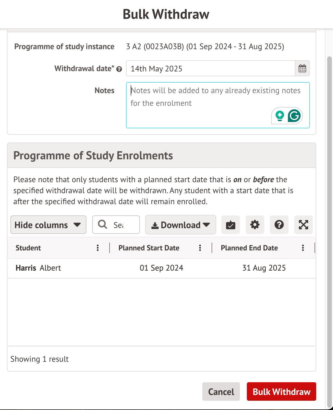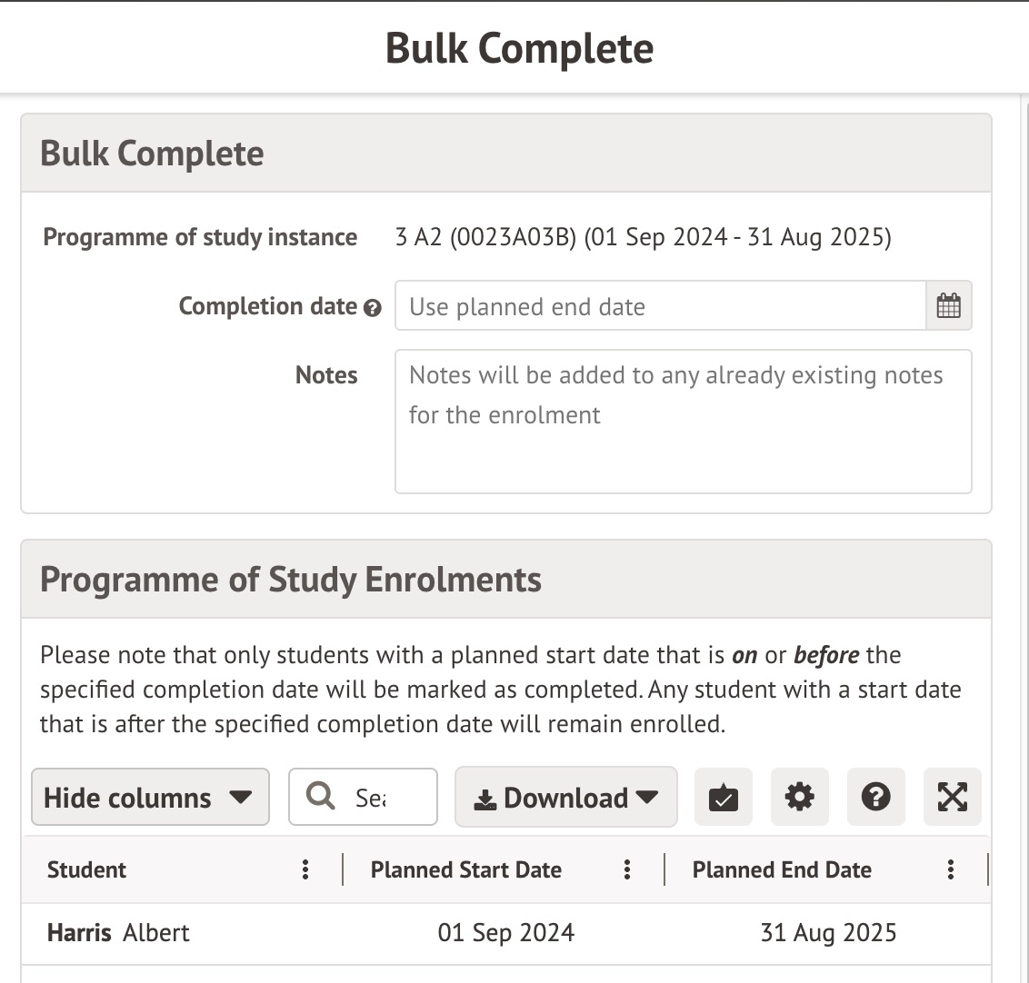 - Set the planned start and end dates for the students' Programmes of Study Instance enrolment