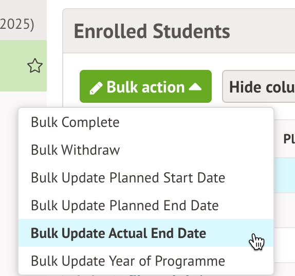 - Use the green Bulk Action button and select Bulk Update Actual End Date