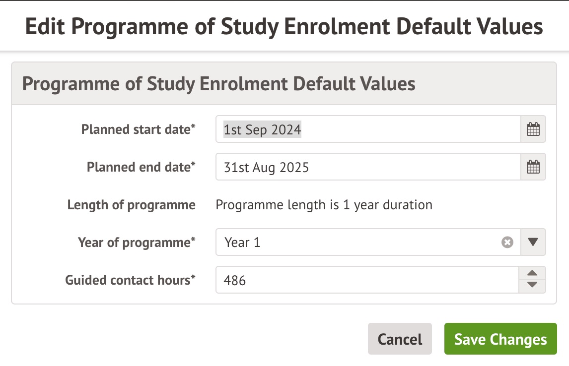 - Click Guided Contact Hours, Year of programme or one of the planned dates in the Programme of Study Enrolment Default Values section