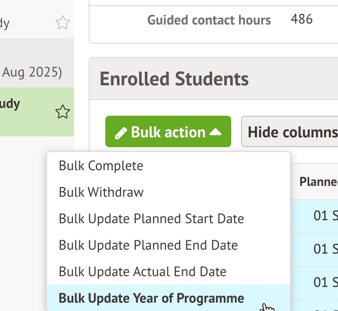 Updating guided contact hours, year of programme or planned dates