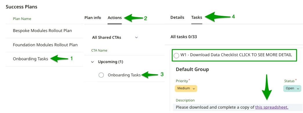 Once you have completed any of the following tasks, head to your Spaces account and ensure you update your progress by ticking off the tasks, these will be found by going to Success Plan > Onboarding Tasks > a slide out will then appear to the right, click on Tasks