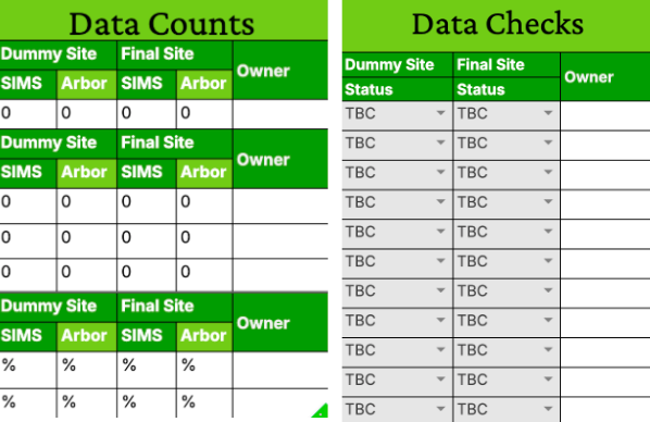 • As you will do these checks twice (once in your Dummy Arbor Site and again in your Final), in your checklist, you will see your Data Counts and Checks are split so you can track and compare your progress for both instances: