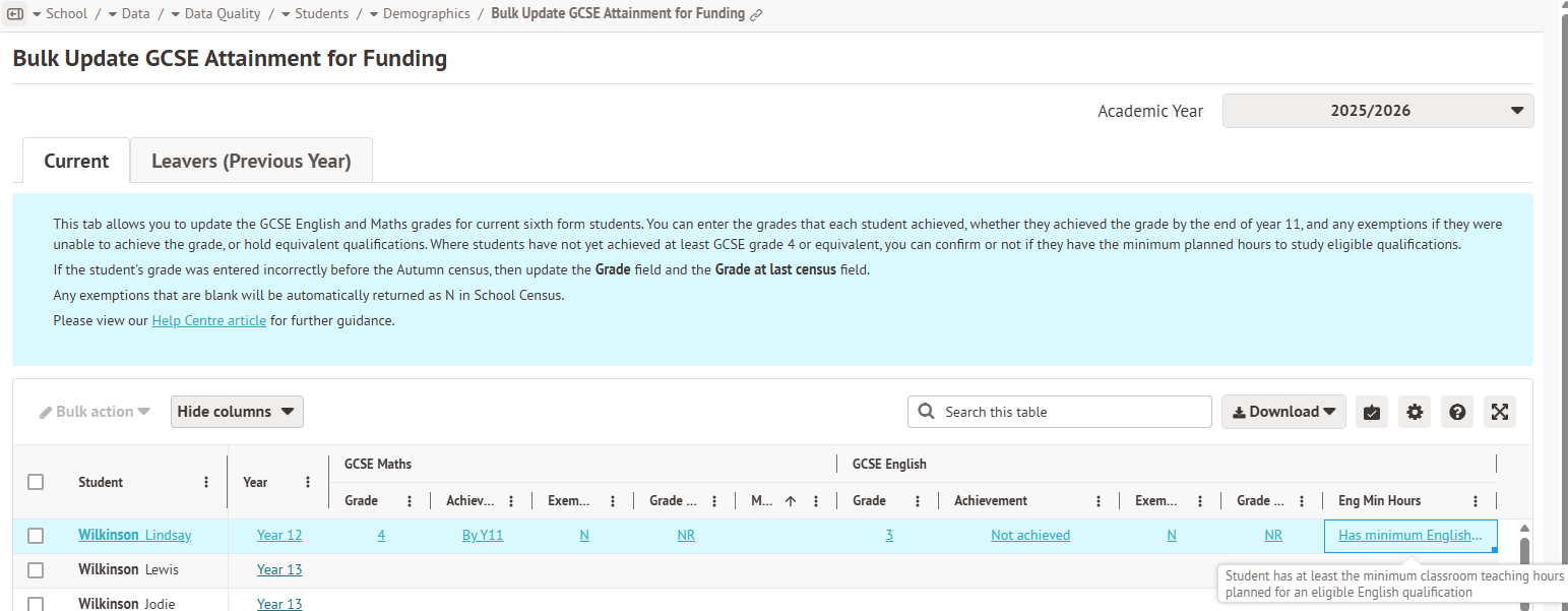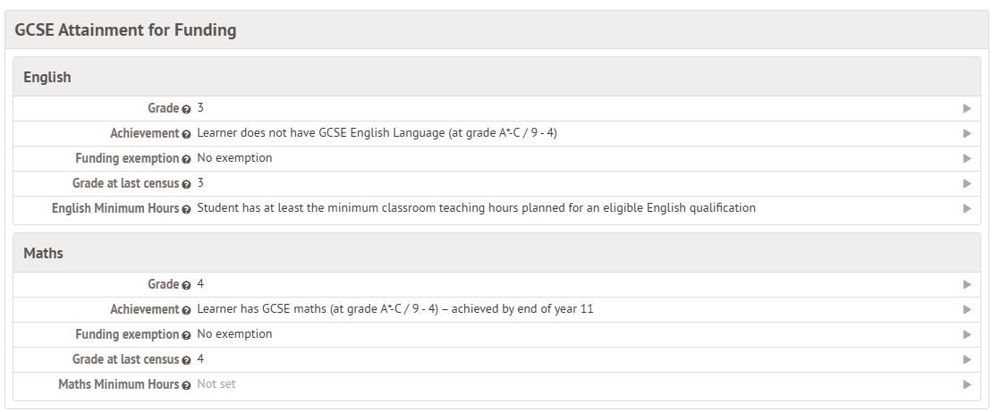 Check if maths minimum hours confirmation or English minimum hours confirmation has been populated. This can be done either on the GCSE Attainment for Funding section in the main page of a student profile or via Bulk Update GCSE Attainment for Funding. Find more on minimum hour confirmations here: Adding prior attainment for English and Maths