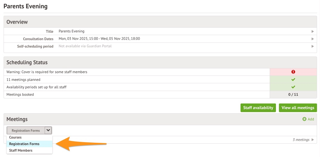 This option does not work for meeting types other than Meetings with registration form tutors. Find more on meeting types here. You can check if meetings were set up as Meetings with registration form tutors on your consultation's overview page in the Meetings section. Meetings of this type will indicate whether you change the grey dropdown to 'Registration Forms'.