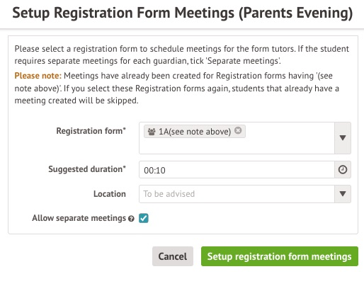 If a student belongs to a registration form group with already scheduled meetings (see Adding Meetings - Setting up Parents Evenings (Guardian Consultations)), you can re-add meetings for the group without duplicating existing student meetings.