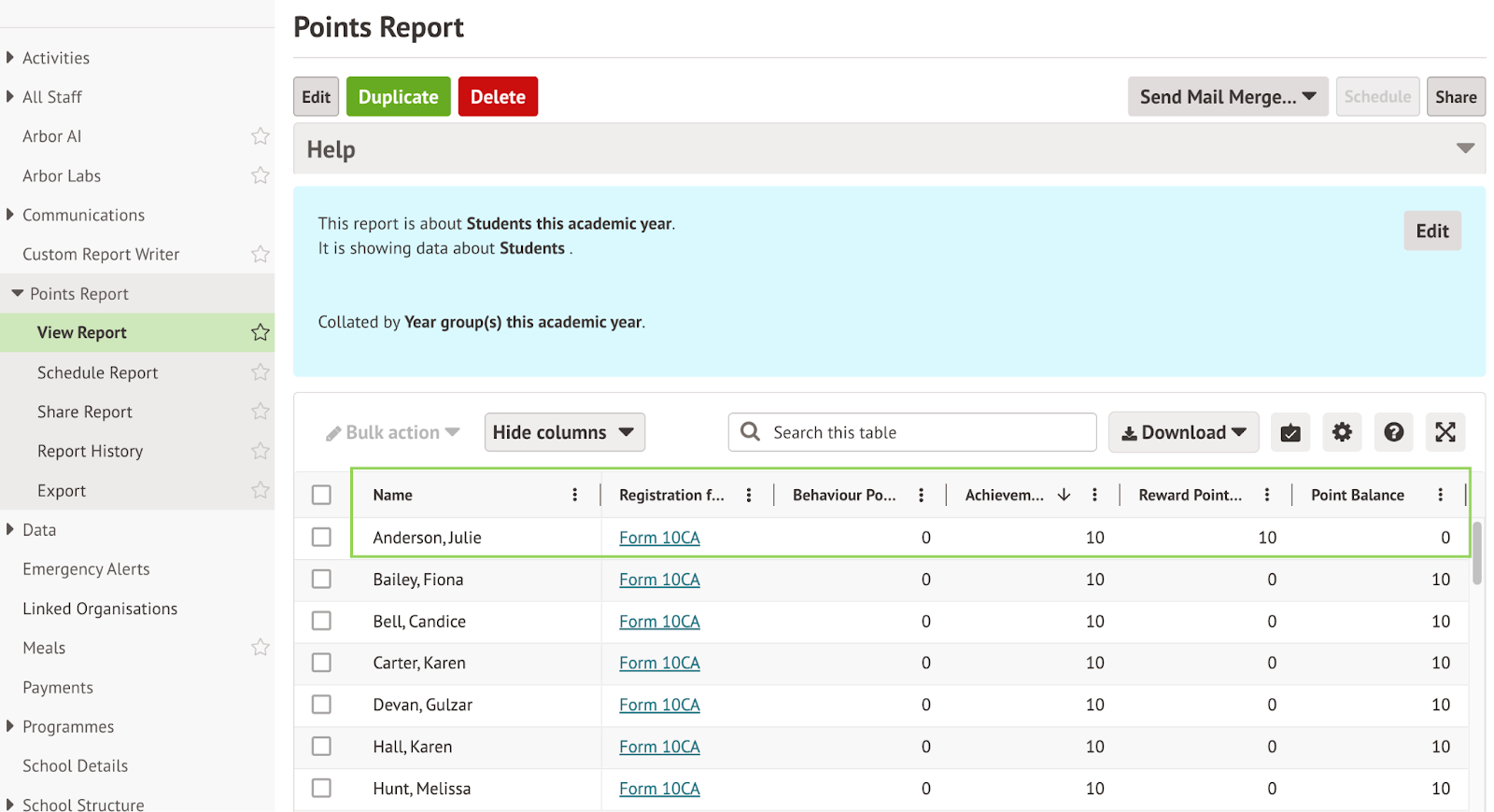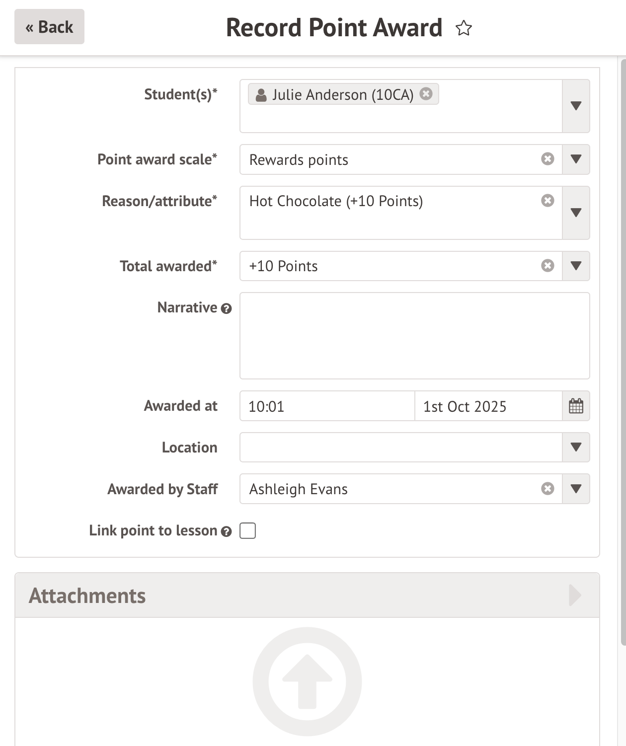 In the example above, we have Behaviour Points (negative points for adverse incidents) and Achievement Points (positive points for positive behaviours.