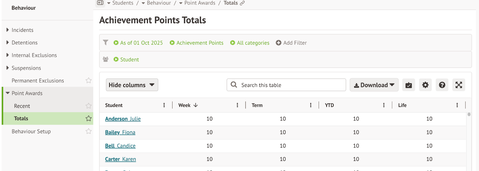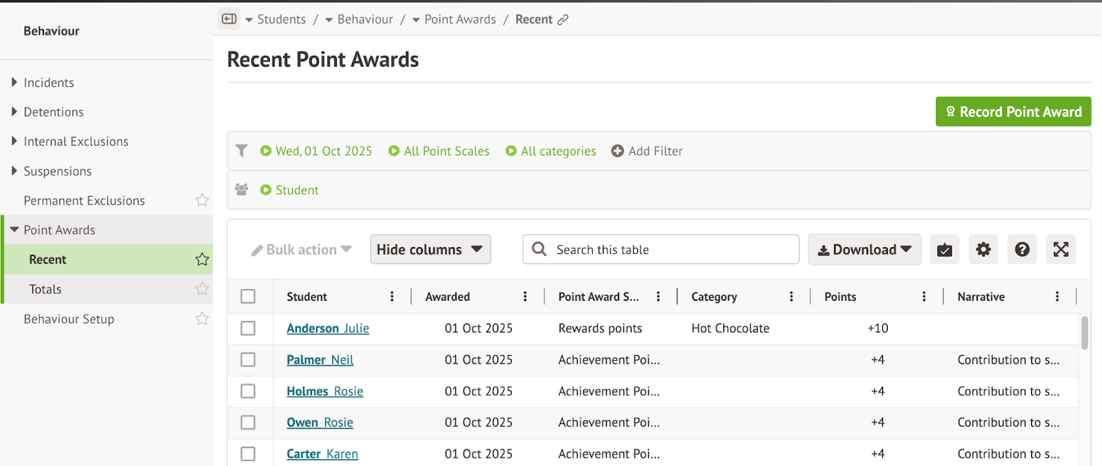 And you can see their Point Award Totals in Students > Behaviour > Point Awards > Totals