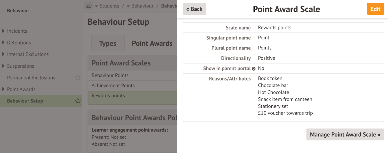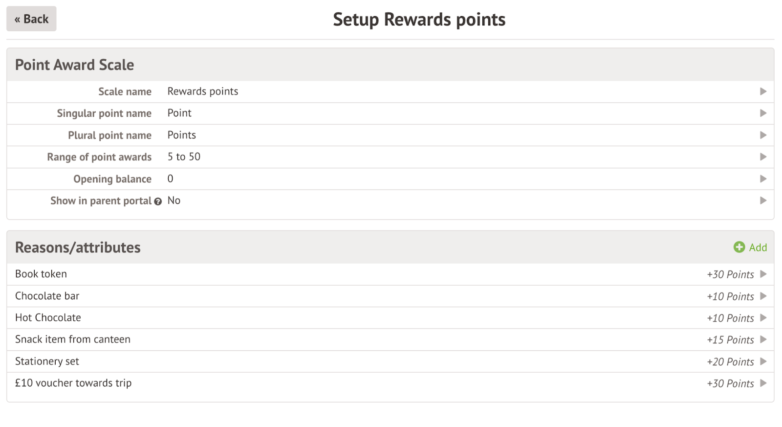 Once this third scale is set up, you can click back onto it and click the grey ‘Manage Point Award Scale’ button. Under the Reasons/Attributes area, you would add in the items that the pupils can ‘buy’ and how many points they’re worth, like in the example shown here:
