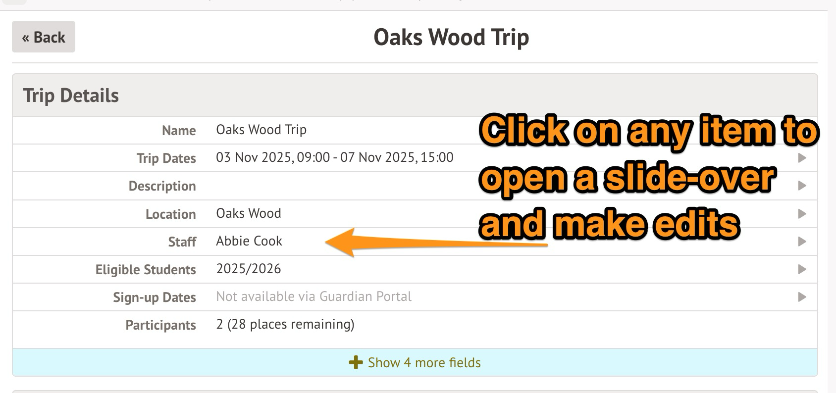 To make changes, navigate to the trip's overview page: School > Activities > Trips, then click the trip and select More Information.