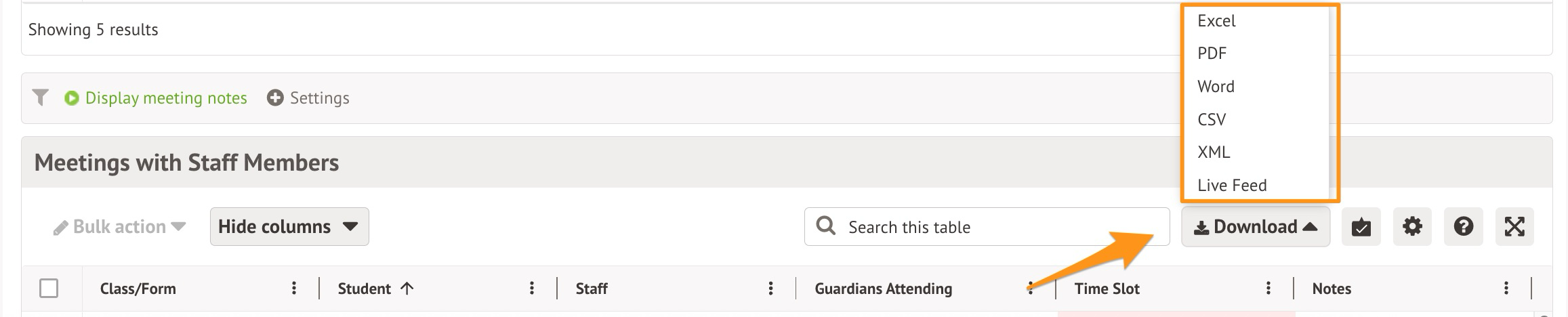 Top tip: To export this table, use the grey Download button above the respective table and select your preferred format. Please note that if you set a table filter before exporting (for example, to exclude booked meetings), this filter will not be applied to your export (in this case, it will list both booked and unbooked meetings).