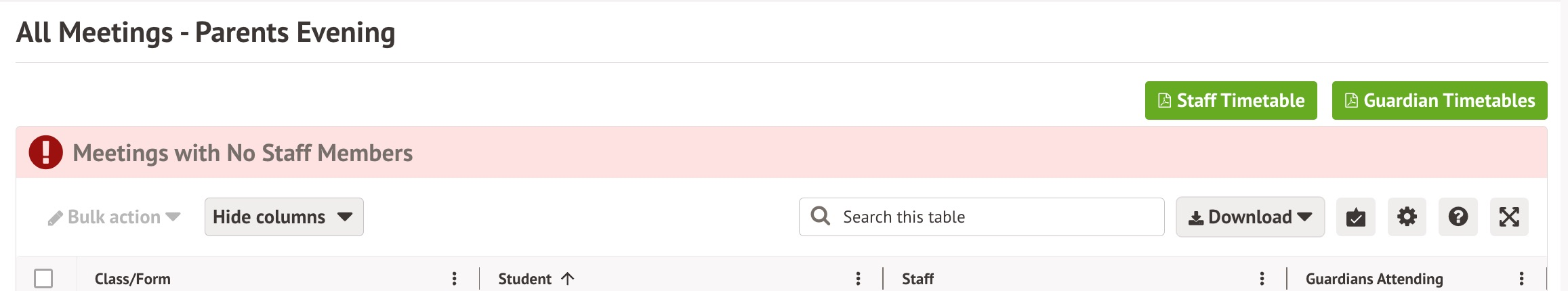 If you have any meetings planned that do not have a staff member assigned, these show in a separate Meetings with No Staff Members table. This allows you to easily identify meetings that are not bookable because no staff are assigned.