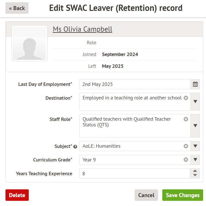 The Leaver record includes basic job role and year/subject taught-type information, but not personal details like name. Data that is included is: