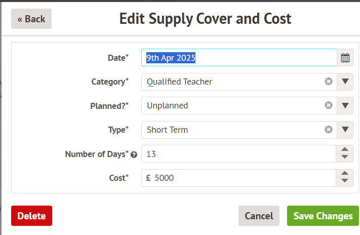 Navigate to School > All Staff > Cover > Supply Cover and Costs. Edit an existing record by: