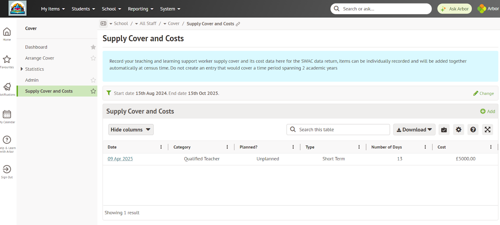 This guide explains how to record Supply Cover and Costs and SWAC Leavers for the Supply and Retention modules of the Welsh School Workforce Annual Census (SWAC) return in Arbor. These are Historical modules, covering the previous academic year (1 September 2024 to 31 August 2025).