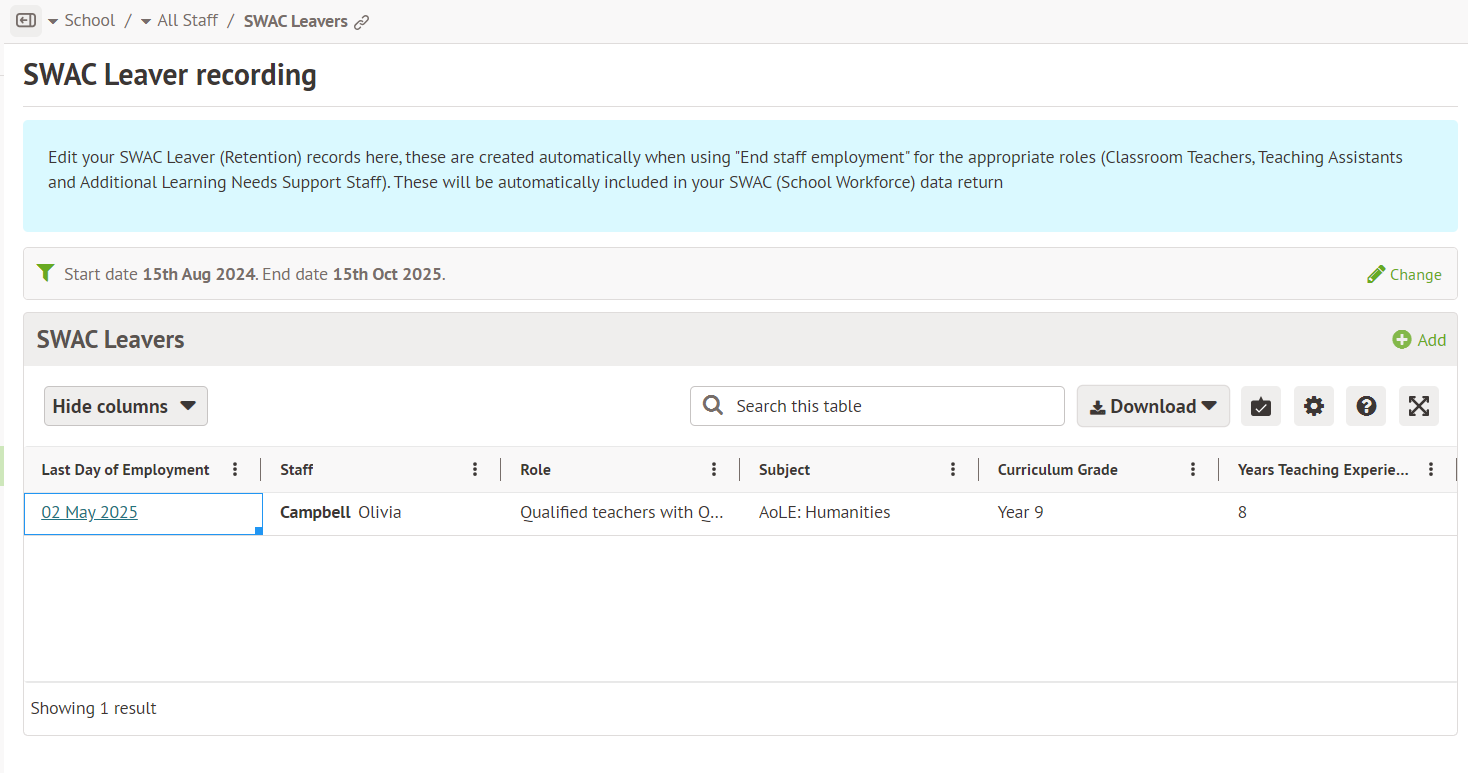 Leaver records are automatically generated when you use "End staff employment" for appropriate roles (Classroom Teachers, Teaching Assistants, and Additional Learning Needs Support Staff). You can also edit a record by clicking on it or create an ad-hoc record here using +Add if needed.