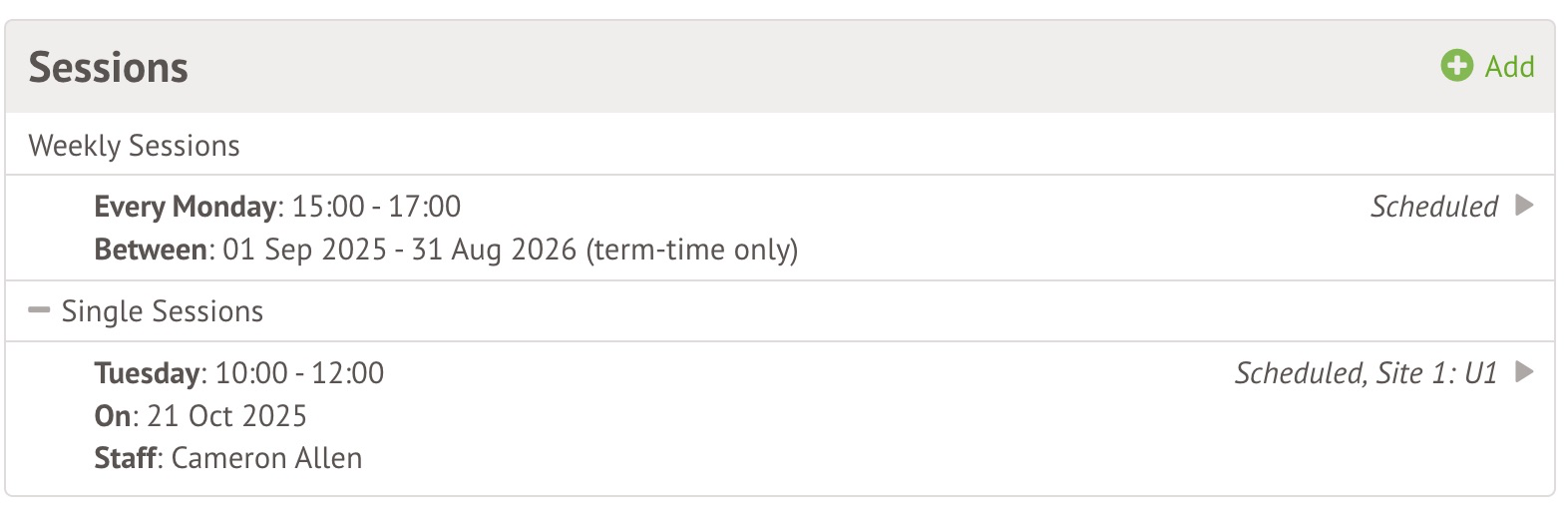 Note: it is harder to make changes to single sessions, compared to those scheduled to repeat weekly. If you need to change the times and dates of the session or the staff assigned, consider scheduling this as a repeating session with the same start and end date instead.