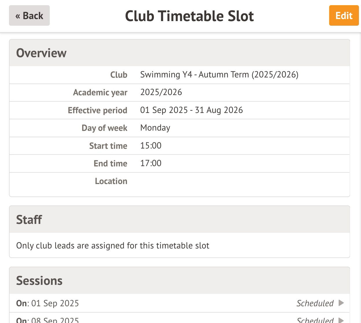 Click on one of these repeating club timetable slots to do any of the following on a slide-over: