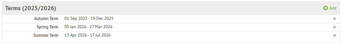 • Enter your term dates for the new academic year: You can set terms for any dates, either as full terms of split into half terms. Your term dates can include or exclude holidays. For example, the autumn term could run from 01/09/2025 to 19/12/2025, and then the Christmas holiday would run from 20/12/2025 to 04/01/2026, excluding the Christmas holiday from the term dates. Or the Autumn term could end on 04/01/2026, including the Christmas holiday dates in the term dates.