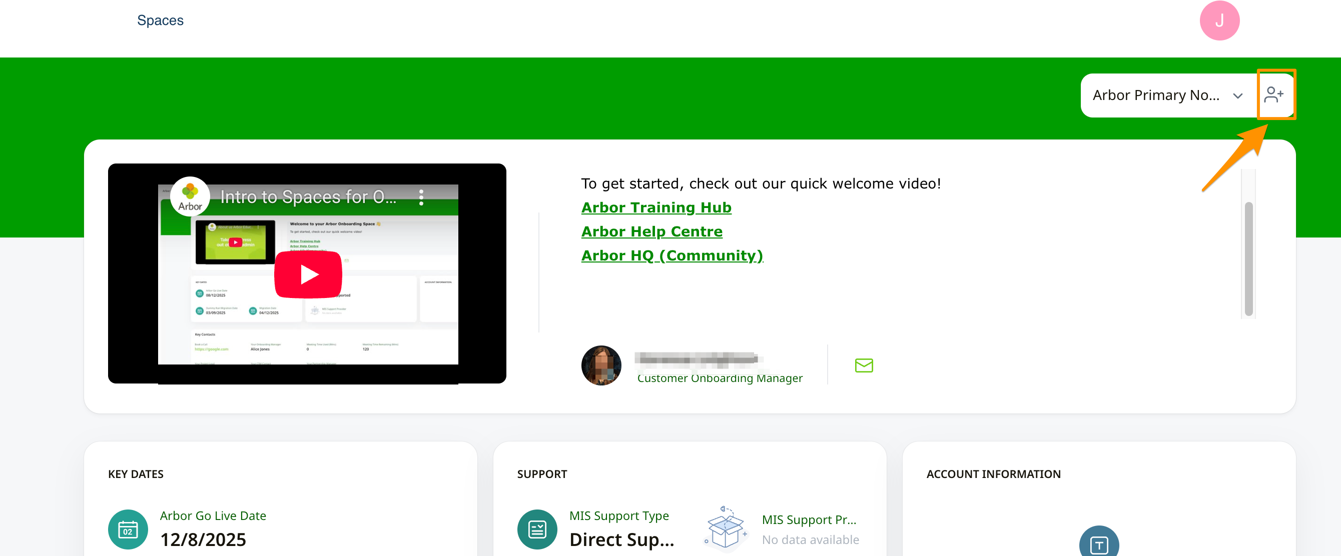 When you log in to Spaces for the first time, it is recommended that you watch the welcome video and check out the linked sections, the Arbor Training Hub, the Help Centre, and Arbor HQ.