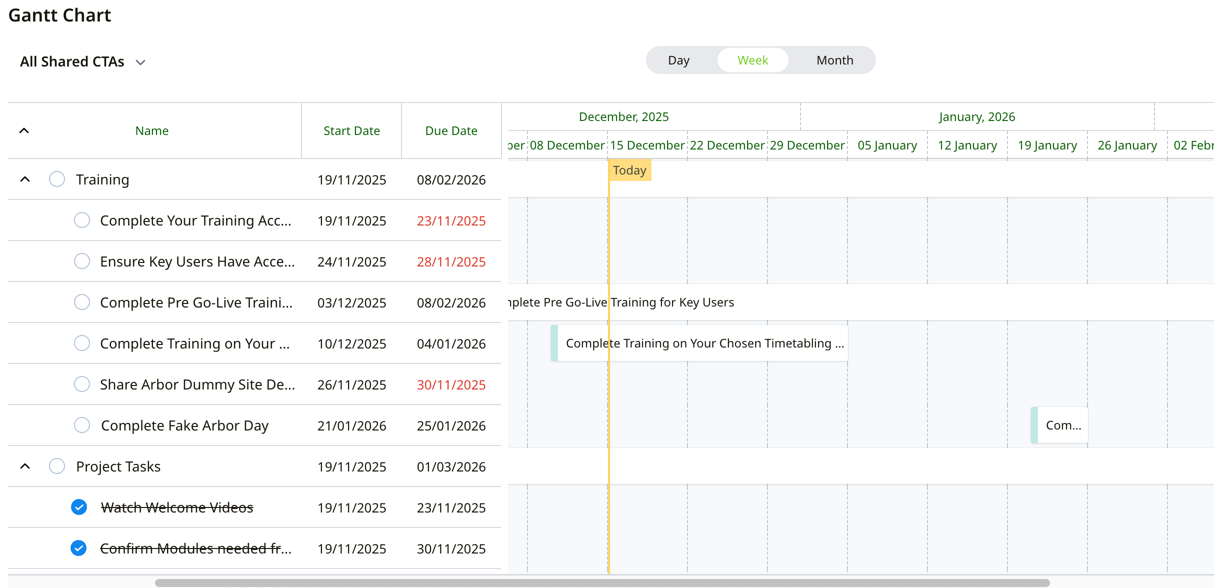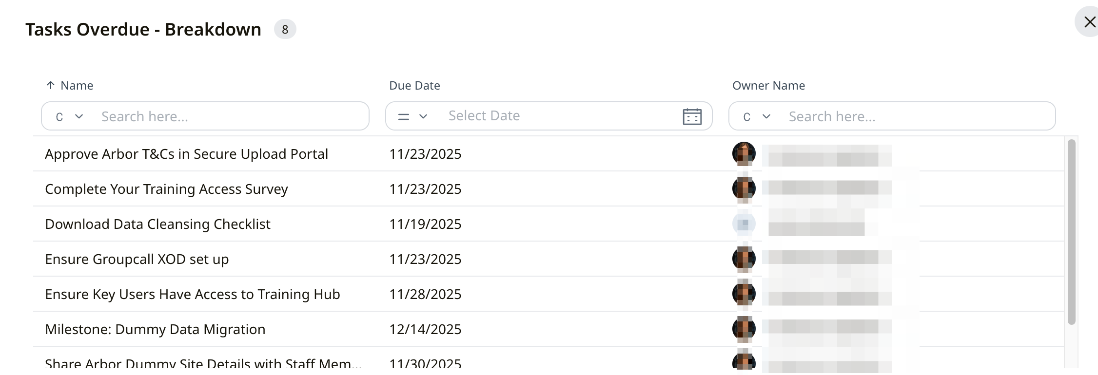 - Data Migration: This displays all activities related to moving your data, including setting up GroupCall and checking data in both your current MIS and in Arbor during the dummy and final site stages.