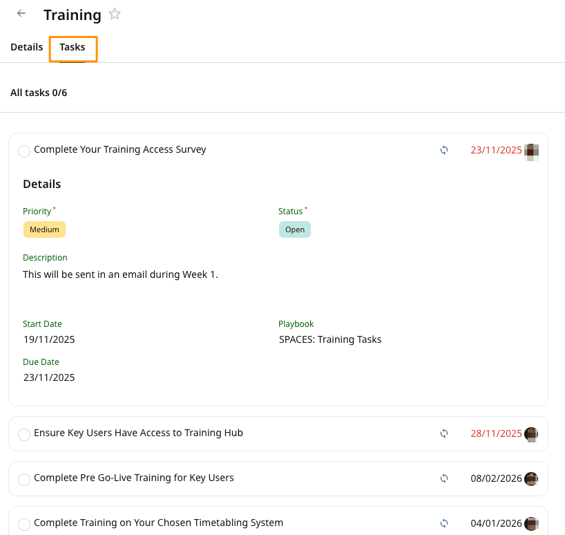 - Project Tasks: This area holds all tasks for your overall Spaces onboarding, like watching the welcome video, confirming modules for Go-Live, and confirming your third-party integrations.
