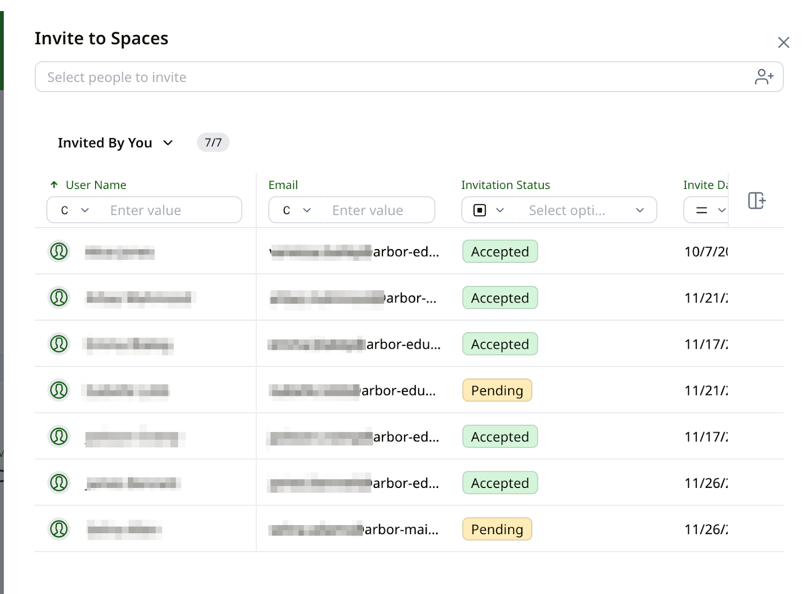 In the invite area, you can also see who has already been invited and whether they have logged in to Spaces (accepted) or not (pending), or if access has been taken away (revoked):