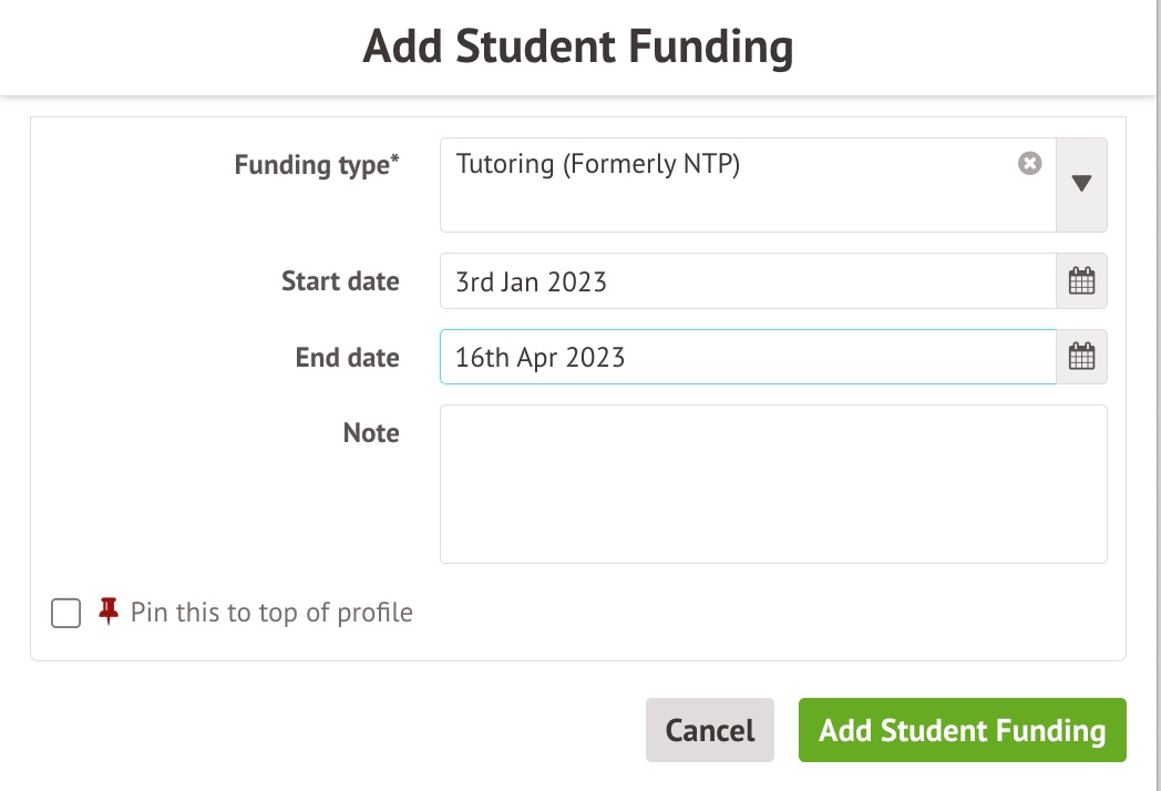 Enter the dates that they will be getting funding to and from, then click the green Add Student Funding button.