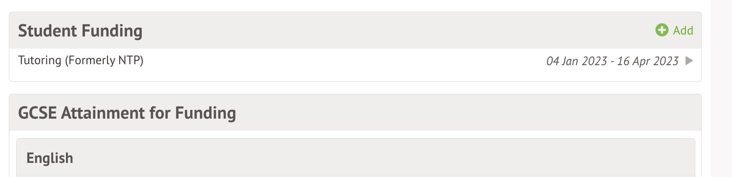 You can record when the student received Learner funding and monitoring (FAM) as a top-up funding type from the Student Funding section of the student profile. Click +Add.