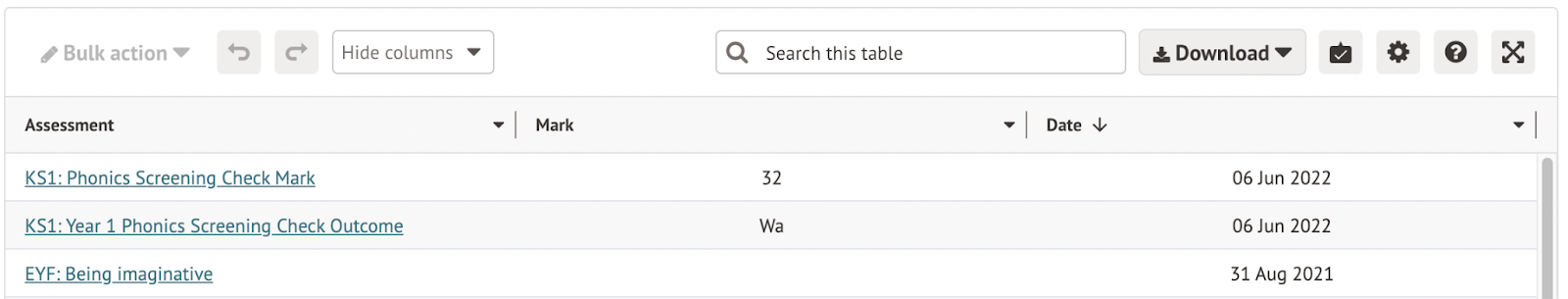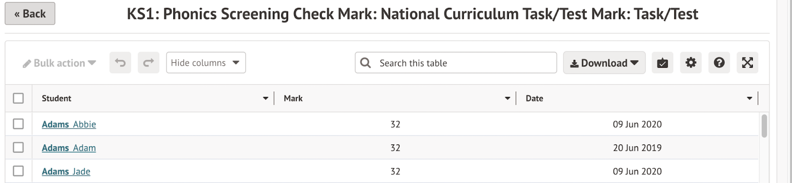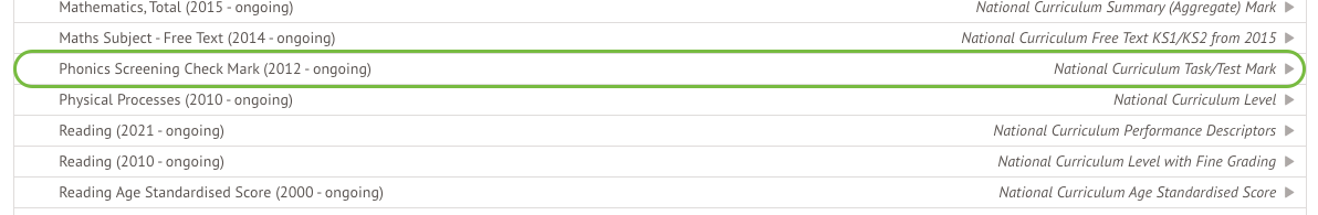 - Select the appropriate Key Stage and then the component you would like to view, e.g End of Key Stage 1 > Phonics Screening Check Mark