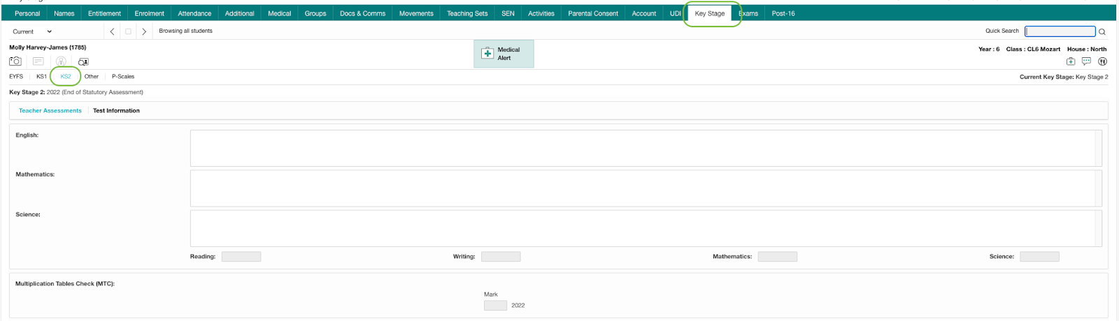 To view Key Stage data per student, on the student record, select the Key Stage tab and the relevant Key Stage: