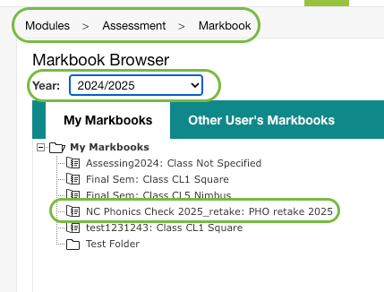 To view Key Stage data per academic year, if they have been previously set up, you can navigate to, select the appropriate academic year and view all the available markbooks.
