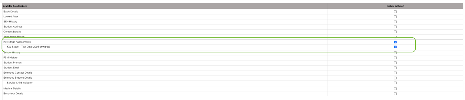 - When selecting the Export Options, ensure only the Key Stage Assessments options are ticked as below: