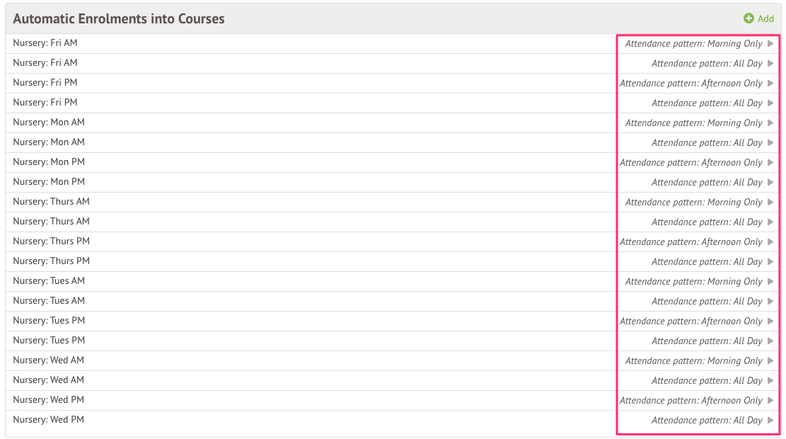 - In the Automatic Enrolments section, you should have all of the AM modules linked to “morning only” attendance patterns, all of the PM modules linked to “afternoon only” attendance patterns, and all of the modules should be linked to “all day” attendance patterns. Please see the screenshot below: