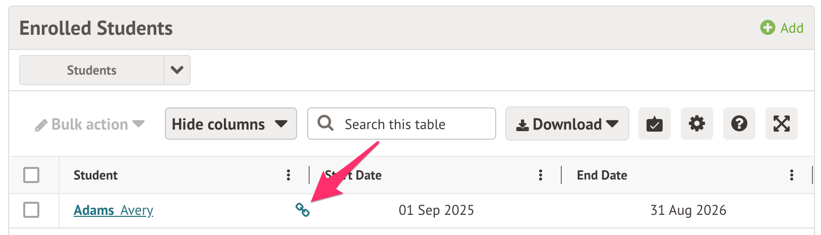 When you scroll down to the Enrolled Students section of a course, if a student has a chain icon next to their name, this means that their enrolment can't be changed because of an automatic enrolment.
